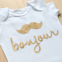 Simple freezer paper serves as a stencil for this french mustache onesie. Ironing the wax paper to the shirt can keep the lightweight material on while you fill in the cut out with fabric paint. Essentially Eclectic makes some great suggestions about painting, peeling the paper and other adorably funny stencil designs.