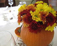 It'll take a few minutes to hollow out a pumpkin to use as a vase, but think of it this way: You can always toast the seeds to use as an appetizer. After the pumpkin has been emptied, slice off a thin section from the bottom (to stabilize the gourd), fill with water and add flowers.