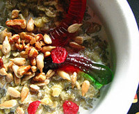 Your morning breakfast, made freakily festive: Top oatmeal with dried fruit, nuts and a few gummi worms. Maybe give the worms to the kids, on second thought.
