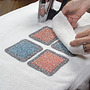 Steam blocking is a method recommended for yarns made primarily from plant fibers or synthetics, but not for wool, silk, or alpaca. Blocking methods for those fibers will be discussed later. In general, blocking is any means used to help all the stitches relax into one another, to even the tension of all the stitches, and to make the finished fabric lie flat at its correct dimensions. To block your coasters with steam, cover an ironing board or other flat surface with a terry cloth towel. Lay the coasters on the towel and use fingers to shape them into nice squares. Pin in place if they seem prone to shifting, but pinning is optional. Lay a dampened towel over the coasters. Set the iron to its highest dry temperature setting. The moisture in the top towel will provide a more even steaming than the steam jet of the iron could. Set the hot iron gently down on the dampened upper towel. Hold in place till steam stops rising, move to the next section of towel and repeat. Pressure is not necessary, as the weight of the iron will be sufficient. Merely hold the iron in place, allowing steam to work through the towel to the coasters. When all coasters have been steamed, turn off the iron and remove the top towel. Allow the coasters to cool and dry in place. Pins can be removed and coasters are ready to use when they are cool and dry to the touch.