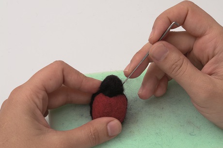 Use another small strand of black wool to make the central line of the ladybug’s body, jabbing it into the back from the head all the way down the body.