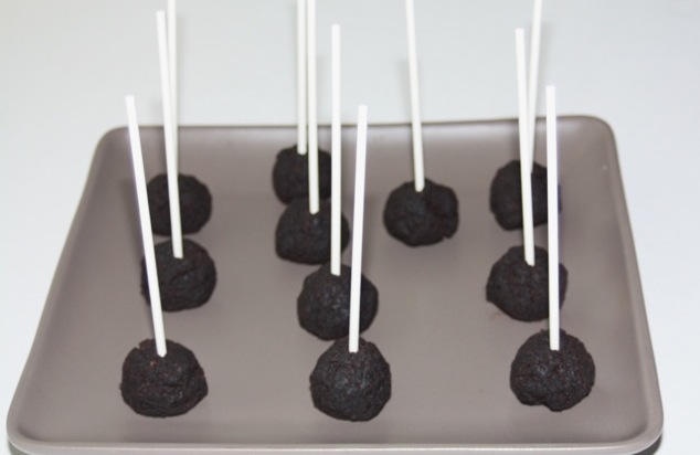 Melt a small amount of chocolate in a cup, and dip the end of a lollipop stick into melted chocolate. Insert the chocolate end of the stick into the center of each cake pop, making sure the stick doesn't poke through to the other side. Repeat with all cake pops, and refrigerate for 15 minutes to make the sticks harden inside the cake. You can stand the cake pops upright in a styrofoam base or lay them on a cookie sheet for this step.