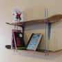 Begin by drilling two holes on each deck where the skateboard trucks were. Put a nut and then thread a washer on each of the rods about 10 centimetres from the tip. Put the rods into the drilled wholes and thread a washer and a nut on the opposite side. Before tightening the nuts make sure the rods are even. Do the same with the other board. After you've done with that, take the “L” brackets, attach them to the bottom of the top deck using the screws and then mount the whole set to the wall.