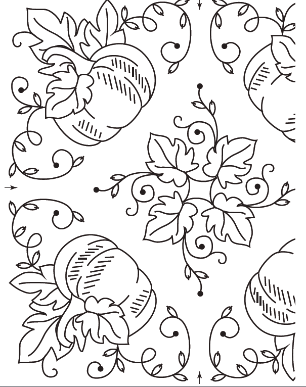 Work the lines in backstitch. The tiny little leaves are worked in detached chain stitch and the shading on the pumpkins is worked in straight stitch.